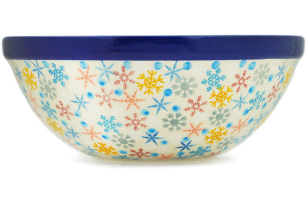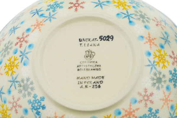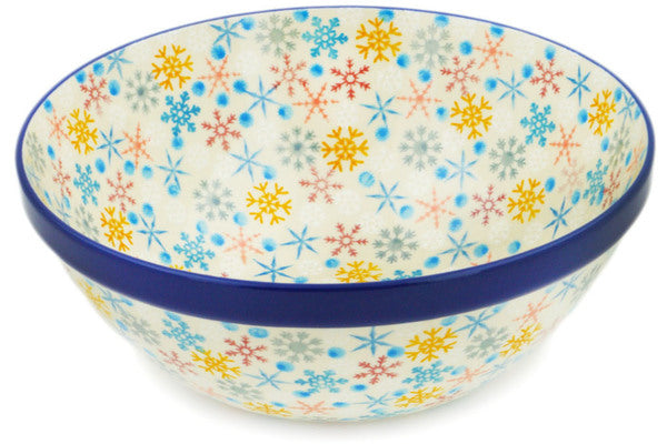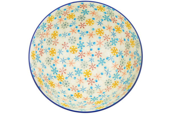 This Vintage Snow Fall 9" Bowl was handmade and hand decorated in Boleslawiec, Poland by skilled artisans according to old traditional methods. This is a Polish pottery Signature Unikat, which means that it has been hand painted with both sponges and brushes and it is signed by the artist who painted it. Unikat pieces are the most intricate works of art. Larger Unikat items take hours of very careful work to finish. This Polish stoneware is microwave, dishwasher, freezer, and oven safe up to 480°F. It does not contain lead or cadmium. It is part of the Vintage Snow Fall Collection.