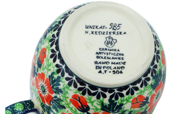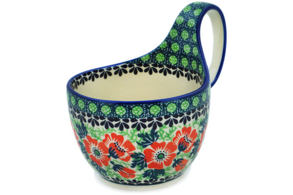 This Marvellous Surprise 16 oz Bowl with Loop-Handle was handmade and hand decorated in Boleslawiec, Poland by skilled artisans according to old traditional methods. This is a Polish pottery Signature Unikat, which means that it has been hand painted with both sponges and brushes and it is signed by the artist who painted it. Unikat pieces are the most intricate works of art. Larger Unikat items take hours of very careful work to finish. This Polish stoneware is microwave, dishwasher, freezer, and oven safe up to 480°F. It does not contain lead or cadmium. It is part of the Marvellous Surprise Collection.