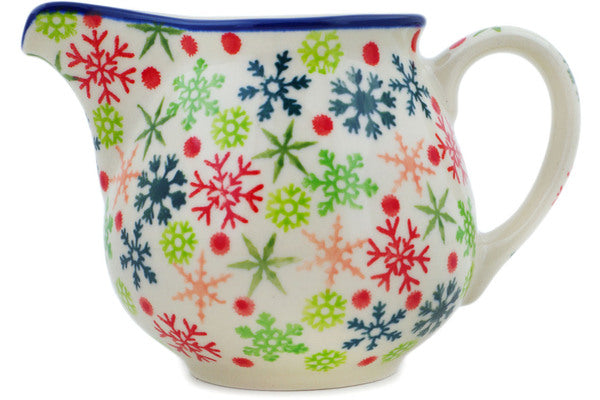 This Holly Jolly 8 oz Creamer was handmade and hand decorated in Boleslawiec, Poland by skilled artisans according to old traditional methods. This is a Polish pottery Signature Unikat, which means that it has been hand painted with both sponges and brushes and it is signed by the artist who painted it. Unikat pieces are the most intricate works of art. Larger Unikat items take hours of very careful work to finish. This Polish stoneware is microwave, dishwasher, freezer, and oven safe up to 480°F. It does not contain lead or cadmium. It is part of the Holly Jolly Collection.