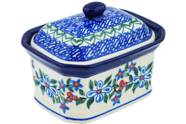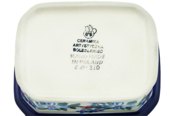 This Azure Blooms 4" Mini Cake Box 4", Salt Box, was handmade and hand decorated in Boleslawiec, Poland by skilled artisans according to old traditional methods. This Polish stoneware is microwave, dishwasher, freezer, and oven safe up to 480°F. It does not contain lead or cadmium. It is part of the Azure Blooms Collection.