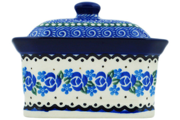 This Blue Bud Sea 4" Mini Cake Box 4", Salt Box, was handmade and hand decorated in Boleslawiec, Poland by skilled artisans according to old traditional methods. This Polish stoneware is microwave, dishwasher, freezer, and oven safe up to 480°F. It does not contain lead or cadmium. It is part of the Blue Bud Sea Collection.