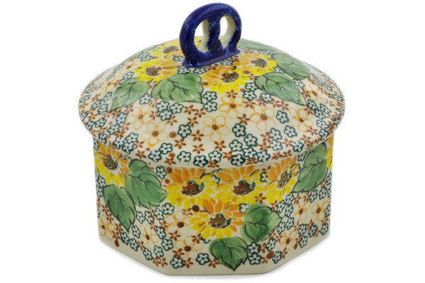 This Country Sunflower 6" Pretzel Jar 6" was handmade and hand decorated in Boleslawiec, Poland by skilled artisans according to old traditional methods. This is a Polish pottery Signature Unikat, which means that it has been hand painted with both sponges and brushes and it is signed by the artist who painted it. Unikat pieces are the most intricate works of art. Larger Unikat items take hours of very careful work to finish. This Polish stoneware is microwave, dishwasher, freezer, and oven safe up to 480°F. It does not contain lead or cadmium. It is part of the Country Sunflower Collection.