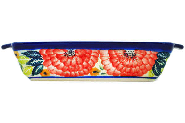 This Garden Heaven 9" Rectangular Baker with Handles was handmade and hand decorated in Boleslawiec, Poland by skilled artisans according to old traditional methods. This is a Polish pottery Signature Unikat, which means that it has been hand painted with both sponges and brushes and it is signed by the artist who painted it. Unikat pieces are the most intricate works of art. Larger Unikat items take hours of very careful work to finish. This Polish stoneware is microwave, dishwasher, freezer, and oven safe up to 480°F. It does not contain lead or cadmium. It is part of the Garden Heaven Collection.