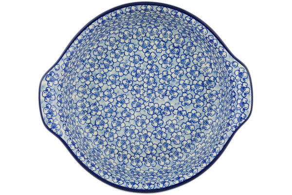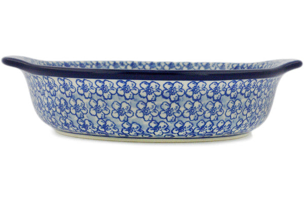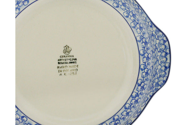 This Magical Blue 9" Round Baker with Handles was handmade and hand decorated in Boleslawiec, Poland by skilled artisans according to old traditional methods. This Polish stoneware is microwave, dishwasher, freezer, and oven safe up to 480°F. It does not contain lead or cadmium. It is part of the Magical Blue Collection.