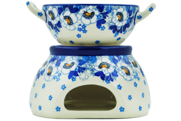 This Blue Spring Set for Fondue was handmade and hand decorated in Boleslawiec, Poland by skilled artisans according to old traditional methods. This Polish stoneware is microwave, dishwasher, freezer, and oven safe up to 480°F. It does not contain lead or cadmium. It is part of the Blue Spring Collection.