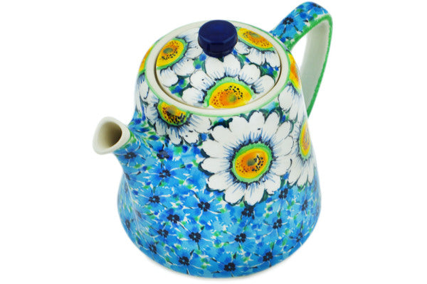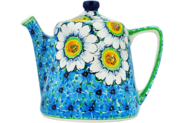 This Pansies And Daisies 29 oz Tea or Coffee Pot was handmade and hand decorated in Boleslawiec, Poland by skilled artisans according to old traditional methods. This is a Polish pottery Signature Unikat, which means that it has been hand painted with both sponges and brushes and it is signed by the artist who painted it. Unikat pieces are the most intricate works of art. Larger Unikat items take hours of very careful work to finish. This Polish stoneware is microwave, dishwasher, freezer, and oven safe up to 480°F. It does not contain lead or cadmium. It is part of the Pansies And Daisies Collection.