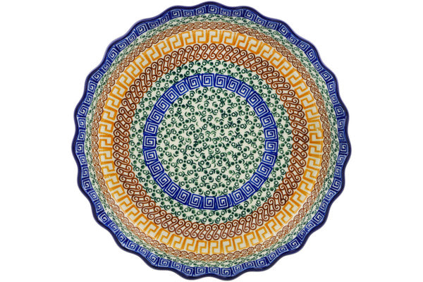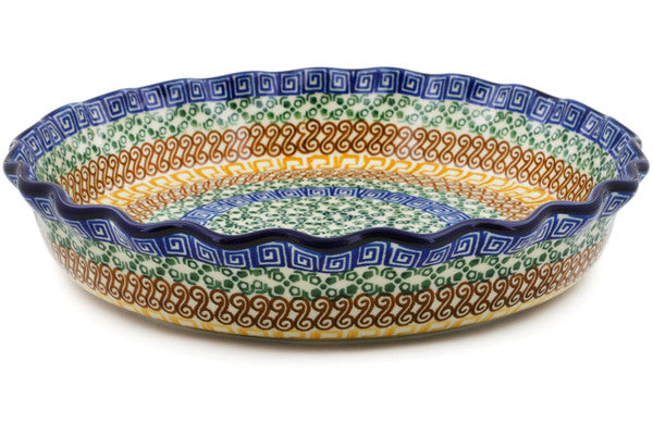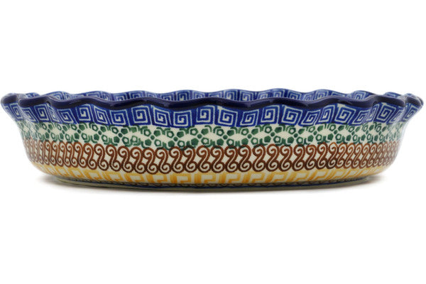 This Grecian Sea 10" Fluted Pie Dish was handmade and hand decorated in Boleslawiec, Poland by skilled artisans according to old traditional methods. This Polish stoneware is microwave, dishwasher, freezer, and oven safe up to 480°F. It does not contain lead or cadmium. It is part of the Grecian Sea Collection.