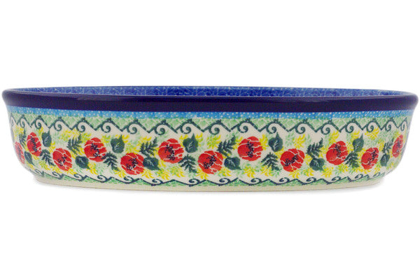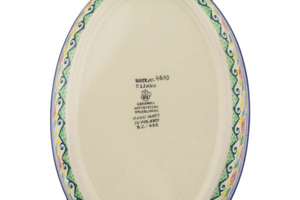 This Splendid Meadow 11" Oval Baker was handmade and hand decorated in Boleslawiec, Poland by skilled artisans according to old traditional methods. This is a Polish pottery Signature Unikat, which means that it has been hand painted with both sponges and brushes and it is signed by the artist who painted it. Unikat pieces are the most intricate works of art. Larger Unikat items take hours of very careful work to finish. This Polish stoneware is microwave, dishwasher, freezer, and oven safe up to 480°F. It does not contain lead or cadmium. It is part of the Splendid Meadow Collection.