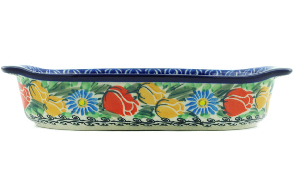 This Breathtaking Tulips 8" Oval Baker with Handles was handmade and hand decorated in Boleslawiec, Poland by skilled artisans according to old traditional methods. This is a Polish pottery Signature Unikat, which means that it has been hand painted with both sponges and brushes and it is signed by the artist who painted it. Unikat pieces are the most intricate works of art. Larger Unikat items take hours of very careful work to finish. This Polish stoneware is microwave, dishwasher, freezer, and oven safe up to 480°F. It does not contain lead or cadmium. It is part of the Breathtaking Tulips Collection.