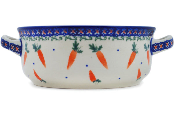 This Carrot Delight 8" Round Baker with Handles was handmade and hand decorated in Boleslawiec, Poland by skilled artisans according to old traditional methods. This Polish stoneware is microwave, dishwasher, freezer, and oven safe up to 480°F. It does not contain lead or cadmium. It is part of the Carrot Delight Collection.