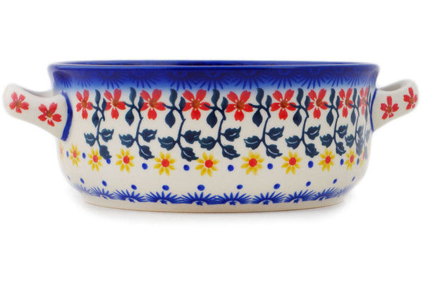 This Red Sunflower 8" Round Baker with Handles was handmade and hand decorated in Boleslawiec, Poland by skilled artisans according to old traditional methods. This Polish stoneware is microwave, dishwasher, freezer, and oven safe up to 480°F. It does not contain lead or cadmium. It is part of the Red Sunflower Collection.