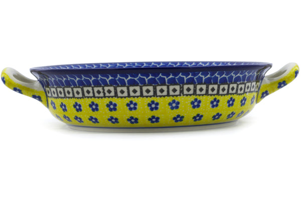 This Sunburst Daisies Medium Round Baker with Handles was handmade and hand decorated in Boleslawiec, Poland by skilled artisans according to old traditional methods. This Polish stoneware is microwave, dishwasher, freezer, and oven safe up to 480°F. It does not contain lead or cadmium. It is part of the Sunburst Daisies Collection.