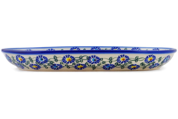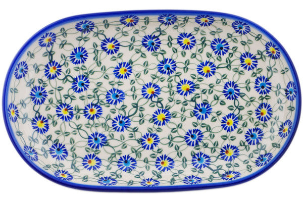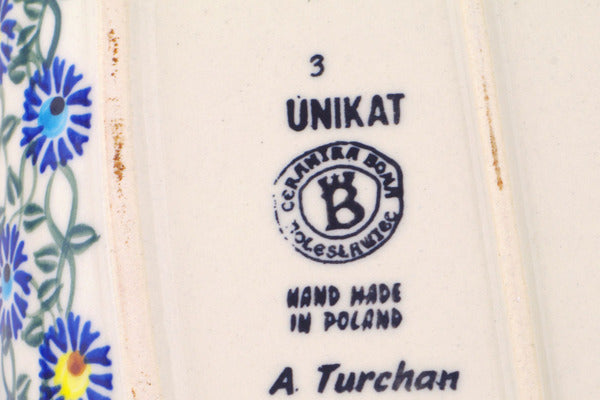 This Blue Thistle Beauty 13" Platter was handmade and hand decorated in Boleslawiec, Poland by skilled artisans according to old traditional methods. This Polish stoneware is microwave, dishwasher, freezer, and oven safe up to 480°F. It does not contain lead or cadmium. It is part of the Blue Thistle Beauty Collection.