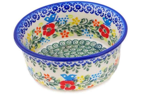 This Ring Of Meadow Flowers 5" Bowl was handmade and hand decorated in Boleslawiec, Poland by skilled artisans according to old traditional methods. This Polish stoneware is microwave, dishwasher, freezer, and oven safe up to 480°F. It does not contain lead or cadmium. It is part of the Ring Of Meadow Flowers Collection.