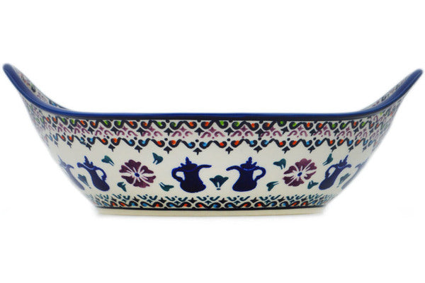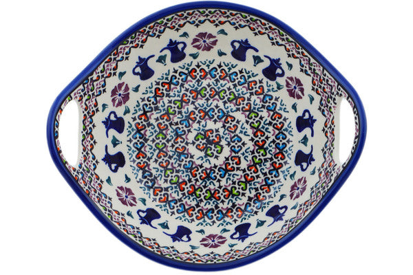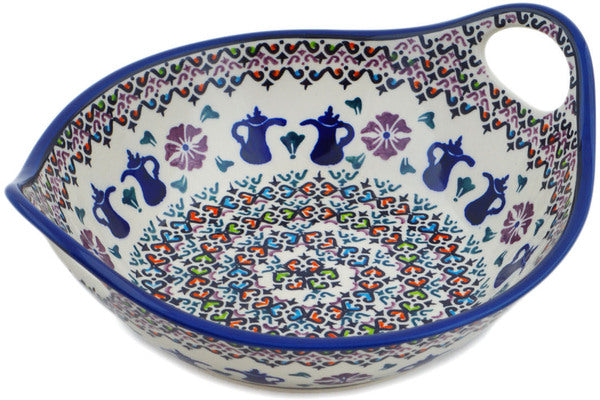 This Tea For Two 10" Bowl with Handles was handmade and hand decorated in Boleslawiec, Poland by skilled artisans according to old traditional methods. This Polish stoneware is microwave, dishwasher, freezer, and oven safe up to 480°F. It does not contain lead or cadmium. It is part of the Tea For Two Collection.