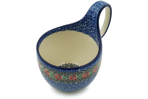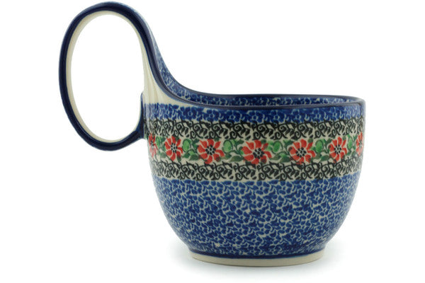 This Red Zinnia 16 oz Bowl with Loop-Handle was handmade and hand decorated in Boleslawiec, Poland by skilled artisans according to old traditional methods. This Polish stoneware is microwave, dishwasher, freezer, and oven safe up to 480°F. It does not contain lead or cadmium. It is part of the Red Zinnia Collection.