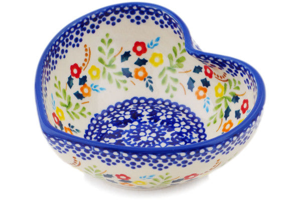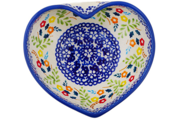 This Rainbow Delight 4" Heart Shaped Bowl was handmade and hand decorated in Boleslawiec, Poland by skilled artisans according to old traditional methods. This is a Polish pottery Signature Unikat, which means that it has been hand painted with both sponges and brushes and it is signed by the artist who painted it. Unikat pieces are the most intricate works of art. Larger Unikat items take hours of very careful work to finish. This Polish stoneware is microwave, dishwasher, freezer, and oven safe up to 480°F. It does not contain lead or cadmium. It is part of the Rainbow Delight Collection.