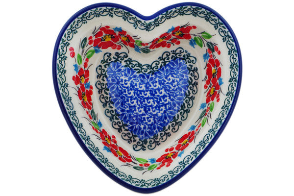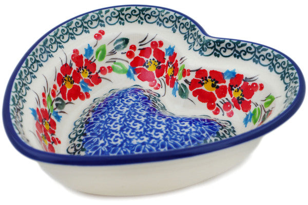 This Cherry Colored Florals 6" Heart Shaped Bowl was handmade and hand decorated in Boleslawiec, Poland by skilled artisans according to old traditional methods. This is a Polish pottery Signature Unikat, which means that it has been hand painted with both sponges and brushes and it is signed by the artist who painted it. Unikat pieces are the most intricate works of art. Larger Unikat items take hours of very careful work to finish. This Polish stoneware is microwave, dishwasher, freezer, and oven safe up to 480°F. It does not contain lead or cadmium. It is part of the Cherry Colored Florals Collection.