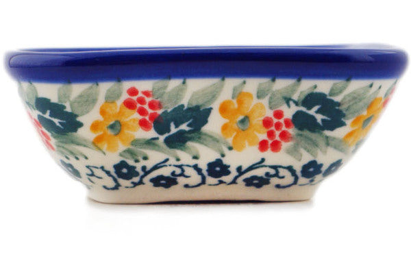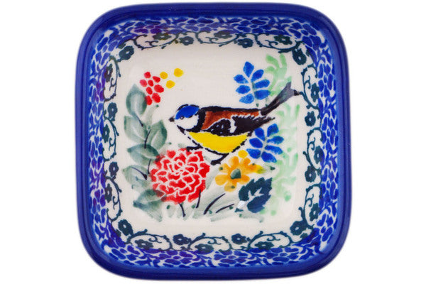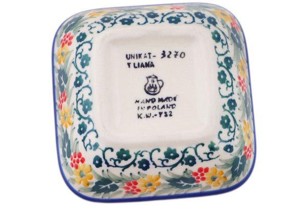 This In The Garden 3" Square Bowl was handmade and hand decorated in Boleslawiec, Poland by skilled artisans according to old traditional methods. This is a Polish pottery Signature Unikat, which means that it has been hand painted with both sponges and brushes and it is signed by the artist who painted it. Unikat pieces are the most intricate works of art. Larger Unikat items take hours of very careful work to finish. This Polish stoneware is microwave, dishwasher, freezer, and oven safe up to 480°F. It does not contain lead or cadmium. It is part of the In The Garden Collection.