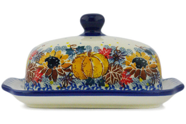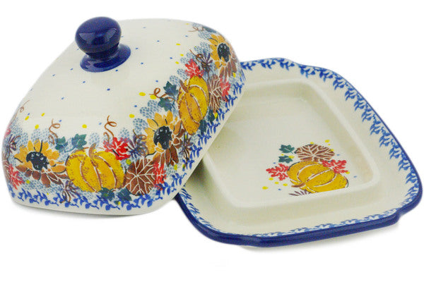 This Autumn Falling Leaves 7" Butter Dish was handmade and hand decorated in Boleslawiec, Poland by skilled artisans according to old traditional methods. This is a Polish pottery Signature Unikat, which means that it has been hand painted with both sponges and brushes and it is signed by the artist who painted it. Unikat pieces are the most intricate works of art. Larger Unikat items take hours of very careful work to finish. This Polish stoneware is microwave, dishwasher, freezer, and oven safe up to 480°F. It does not contain lead or cadmium. It is part of the Autumn Falling Leaves Collection.