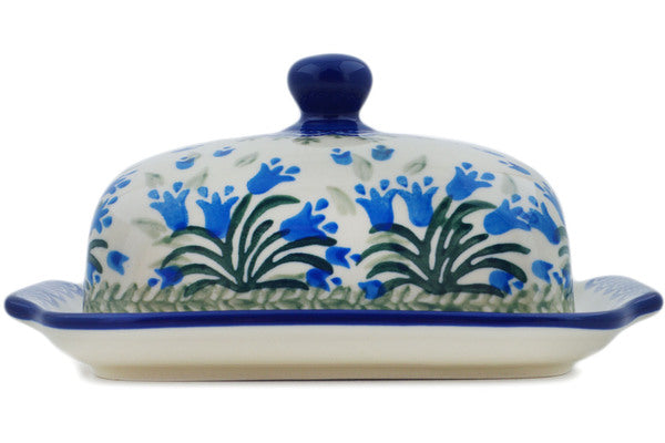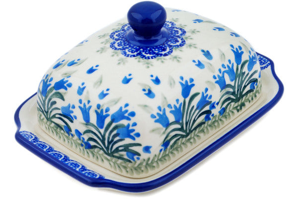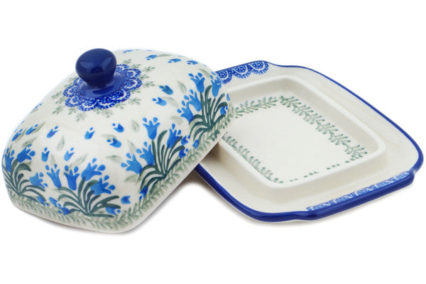 This Feathery Bluebells 7" Butter Dish was handmade and hand decorated in Boleslawiec, Poland by skilled artisans according to old traditional methods. This Polish stoneware is microwave, dishwasher, freezer, and oven safe up to 480°F. It does not contain lead or cadmium. It is part of the Feathery Bluebells Collection.