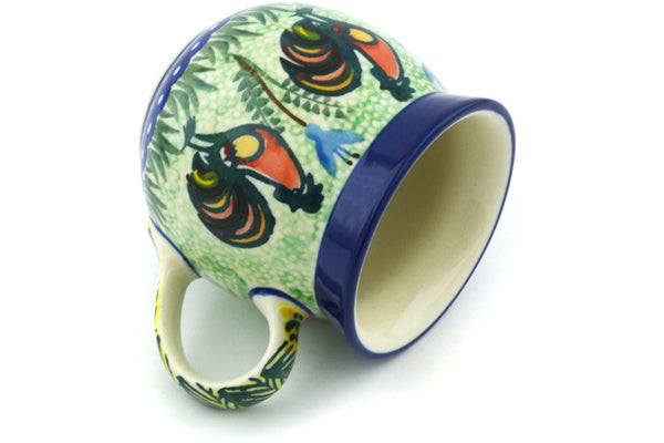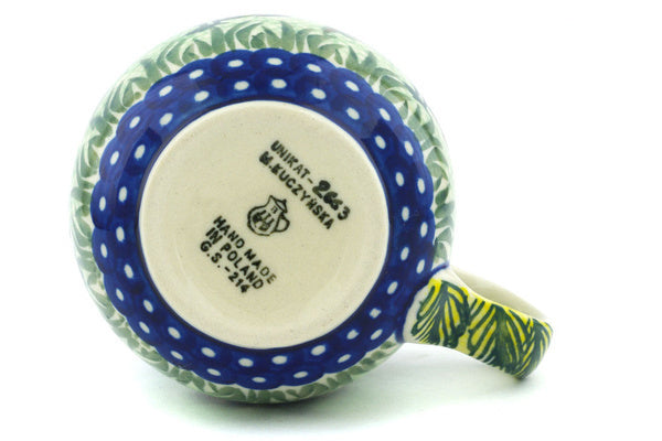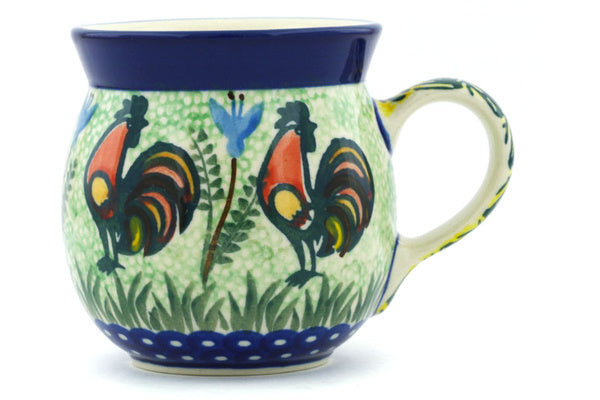 This Rooster Parade 8 oz Bubble Mug was handmade and hand decorated in Boleslawiec, Poland by skilled artisans according to old traditional methods. This is a Polish pottery Signature Unikat, which means that it has been hand painted with both sponges and brushes and it is signed by the artist who painted it. Unikat pieces are the most intricate works of art. Larger Unikat items take hours of very careful work to finish. This Polish stoneware is microwave, dishwasher, freezer, and oven safe up to 480°F. It does not contain lead or cadmium. It is part of the Rooster Parade Collection.