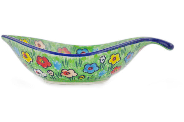 This Whimsical Garden 6" Condiment Dish was handmade and hand decorated in Boleslawiec, Poland by skilled artisans according to old traditional methods. This is a Polish pottery Signature Unikat, which means that it has been hand painted with both sponges and brushes and it is signed by the artist who painted it. Unikat pieces are the most intricate works of art. Larger Unikat items take hours of very careful work to finish. This Polish stoneware is microwave, dishwasher, freezer, and oven safe up to 480°F. It does not contain lead or cadmium. It is part of the Whimsical Garden Collection.