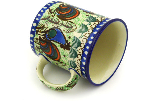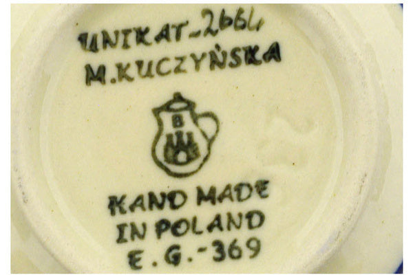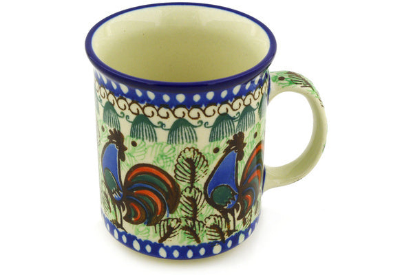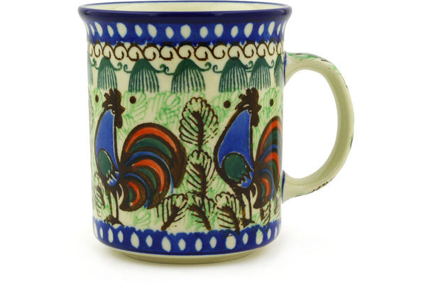 This Rooster Row 10 oz Mug was handmade and hand decorated in Boleslawiec, Poland by skilled artisans according to old traditional methods. This is a Polish pottery Signature Unikat, which means that it has been hand painted with both sponges and brushes and it is signed by the artist who painted it. Unikat pieces are the most intricate works of art. Larger Unikat items take hours of very careful work to finish. This Polish stoneware is microwave, dishwasher, freezer, and oven safe up to 480°F. It does not contain lead or cadmium. It is part of the Rooster Row Collection.