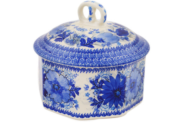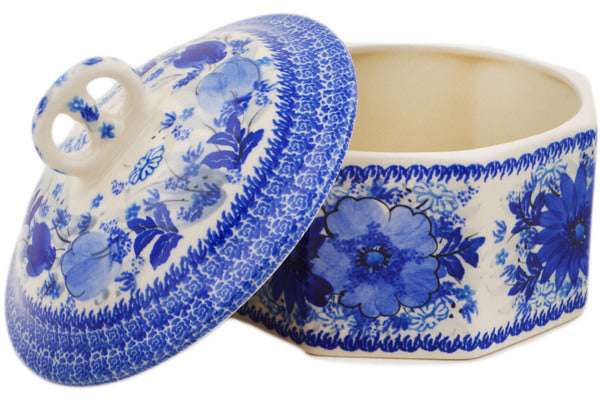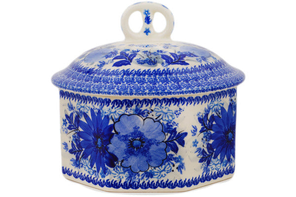 This Blue Wildflower Patch 6" Pretzel Jar 6" was handmade and hand decorated in Boleslawiec, Poland by skilled artisans according to old traditional methods. This is a Polish pottery Signature Unikat, which means that it has been hand painted with both sponges and brushes and it is signed by the artist who painted it. Unikat pieces are the most intricate works of art. Larger Unikat items take hours of very careful work to finish. This Polish stoneware is microwave, dishwasher, freezer, and oven safe up to 480°F. It does not contain lead or cadmium. It is part of the Blue Wildflower Patch Collection.