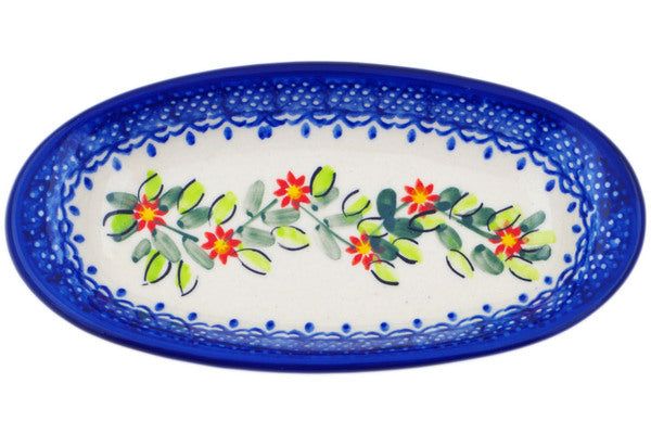 This Elegant Garland 7" Condiment Dish was handmade and hand decorated in Boleslawiec, Poland by skilled artisans according to old traditional methods. This Polish stoneware is microwave, dishwasher, freezer, and oven safe up to 480°F. It does not contain lead or cadmium. It is part of the Elegant Garland Collection.