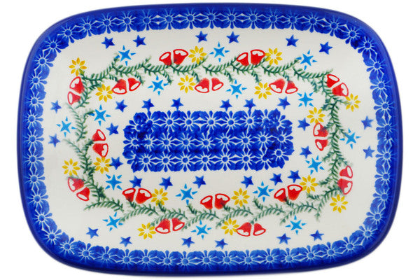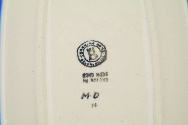 This Wreath Of Bells 10" Platter was handmade and hand decorated in Boleslawiec, Poland by skilled artisans according to old traditional methods. This Polish stoneware is microwave, dishwasher, freezer, and oven safe up to 480°F. It does not contain lead or cadmium. It is part of the Wreath Of Bells Collection.