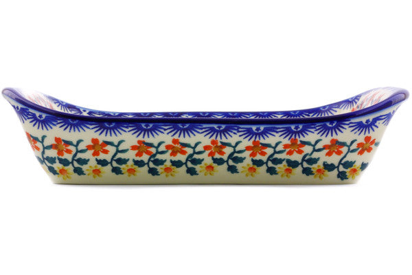 This Red Sunflower 10" Platter with Handles was handmade and hand decorated in Boleslawiec, Poland by skilled artisans according to old traditional methods. This Polish stoneware is microwave, dishwasher, freezer, and oven safe up to 480°F. It does not contain lead or cadmium. It is part of the Red Sunflower Collection.