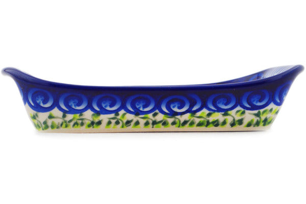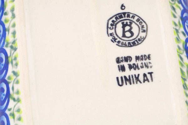 This Gorgeous Morning Glory 7" Platter with Handles was handmade and hand decorated in Boleslawiec, Poland by skilled artisans according to old traditional methods. This is a Polish pottery Signature Unikat, which means that it has been hand painted with both sponges and brushes and it is signed by the artist who painted it. Unikat pieces are the most intricate works of art. Larger Unikat items take hours of very careful work to finish. This Polish stoneware is microwave, dishwasher, freezer, and oven safe up to 480°F. It does not contain lead or cadmium. It is part of the Gorgeous Morning Glory Collection.