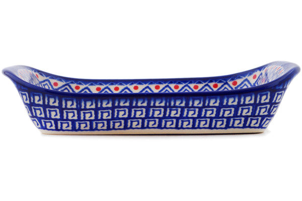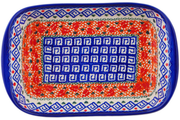 This Grecian Fire Tulips 9" Platter with Handles was handmade and hand decorated in Boleslawiec, Poland by skilled artisans according to old traditional methods. This Polish stoneware is microwave, dishwasher, freezer, and oven safe up to 480°F. It does not contain lead or cadmium. It is part of the Grecian Fire Tulips Collection.