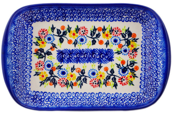 This Pastel Spring Wreath 9" Platter with Handles was handmade and hand decorated in Boleslawiec, Poland by skilled artisans according to old traditional methods. This Polish stoneware is microwave, dishwasher, freezer, and oven safe up to 480°F. It does not contain lead or cadmium. It is part of the Pastel Spring Wreath Collection.