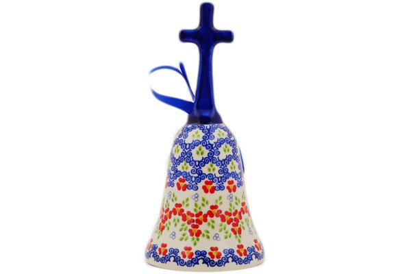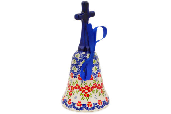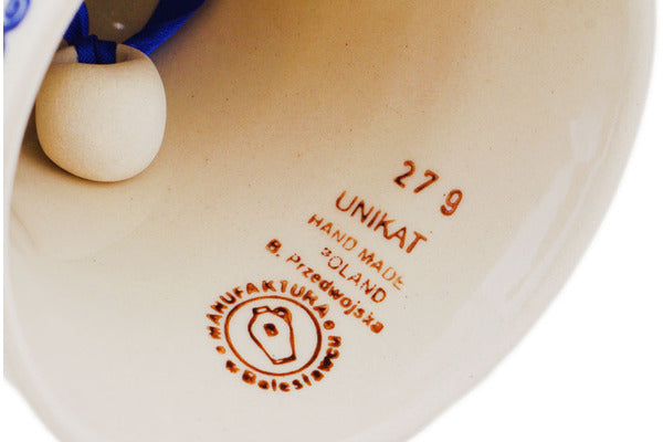 This Red Chains 8" Bell Ornament was handmade and hand decorated in Boleslawiec, Poland by skilled artisans according to old traditional methods. This is a Polish pottery Signature Unikat, which means that it has been hand painted with both sponges and brushes and it is signed by the artist who painted it. Unikat pieces are the most intricate works of art. Larger Unikat items take hours of very careful work to finish. This Polish stoneware is microwave, dishwasher, freezer, and oven safe up to 480°F. It does not contain lead or cadmium. It is part of the Red Chains Collection.
