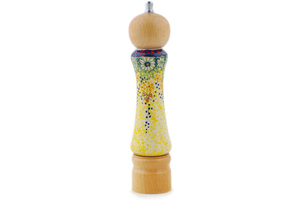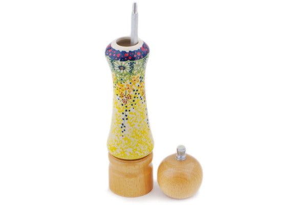 This Sunshine Grotto 8" Grinder was handmade and hand decorated in Boleslawiec, Poland by skilled artisans according to old traditional methods. This is a Polish pottery Signature Unikat, which means that it has been hand painted with both sponges and brushes and it is signed by the artist who painted it. Unikat pieces are the most intricate works of art. Larger Unikat items take hours of very careful work to finish. This Polish stoneware is microwave, dishwasher, freezer, and oven safe up to 480°F. It does not contain lead or cadmium. It is part of the Sunshine Grotto Collection.