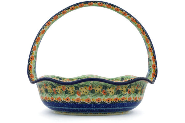 This Bountiful Birds 11" Basket with Handle was handmade and hand decorated in Boleslawiec, Poland by skilled artisans according to old traditional methods. This is a Polish pottery Signature Unikat, which means that it has been hand painted with both sponges and brushes and it is signed by the artist who painted it. Unikat pieces are the most intricate works of art. Larger Unikat items take hours of very careful work to finish. This Polish stoneware is microwave, dishwasher, freezer, and oven safe up to 480°F. It does not contain lead or cadmium. It is part of the Bountiful Birds Collection.