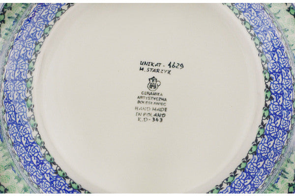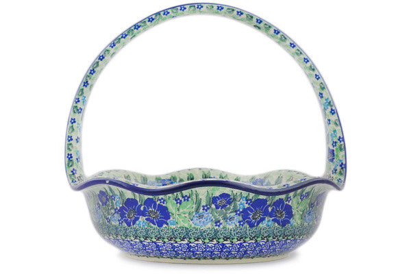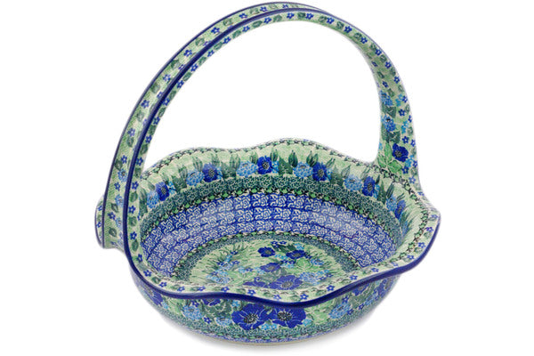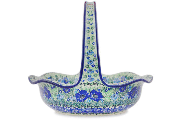 This Moody Blues 11" Basket with Handle was handmade and hand decorated in Boleslawiec, Poland by skilled artisans according to old traditional methods. This is a Polish pottery Signature Unikat, which means that it has been hand painted with both sponges and brushes and it is signed by the artist who painted it. Unikat pieces are the most intricate works of art. Larger Unikat items take hours of very careful work to finish. This Polish stoneware is microwave, dishwasher, freezer, and oven safe up to 480°F. It does not contain lead or cadmium. It is part of the Moody Blues Collection.