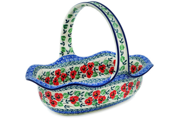 This Red Pansy 11" Basket with Handle was handmade and hand decorated in Boleslawiec, Poland by skilled artisans according to old traditional methods. This Polish stoneware is microwave, dishwasher, freezer, and oven safe up to 480°F. It does not contain lead or cadmium. It is part of the Red Pansy Collection.