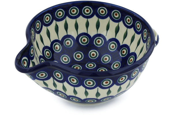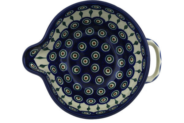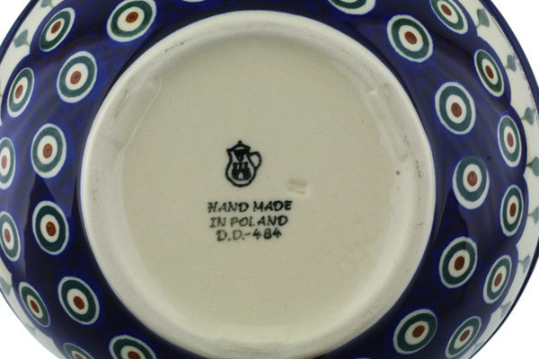 This Peacock Leaves 7½-inch Batter Bowl was handmade and hand decorated in Boleslawiec, Poland by skilled artisans according to old traditional methods. This Polish stoneware is microwave, dishwasher, freezer, and oven safe up to 480°F. It does not contain lead or cadmium. It is part of the Peacock Leaves Collection.