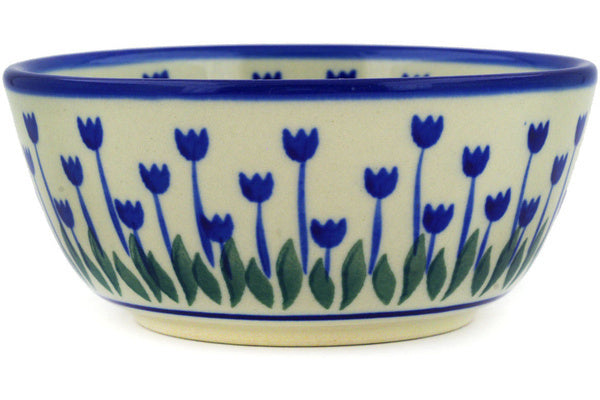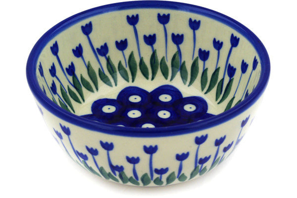 This Blue Tulip Peacock 5" Bowl was handmade and hand decorated in Boleslawiec, Poland by skilled artisans according to old traditional methods. This Polish stoneware is microwave, dishwasher, freezer, and oven safe up to 480°F. It does not contain lead or cadmium. It is part of the Blue Tulip Peacock Collection.