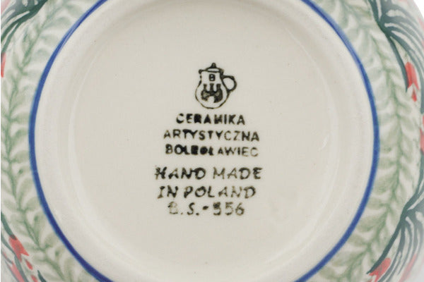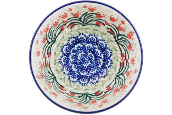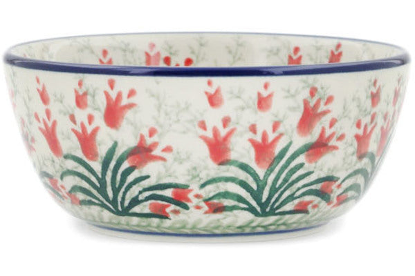 This Crimson Bells 5" Bowl was handmade and hand decorated in Boleslawiec, Poland by skilled artisans according to old traditional methods. This Polish stoneware is microwave, dishwasher, freezer, and oven safe up to 480°F. It does not contain lead or cadmium. It is part of the Crimson Bells Collection.