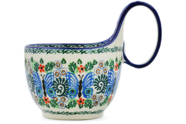 This Blue Butterfly Brigade 16 oz Bowl with Loop-Handle was handmade and hand decorated in Boleslawiec, Poland by skilled artisans according to old traditional methods. This is a Polish pottery Signature Unikat, which means that it has been hand painted with both sponges and brushes and it is signed by the artist who painted it. Unikat pieces are the most intricate works of art. Larger Unikat items take hours of very careful work to finish. This Polish stoneware is microwave, dishwasher, freezer, and oven safe up to 480°F. It does not contain lead or cadmium. It is part of the Blue Butterfly Brigade Collection.