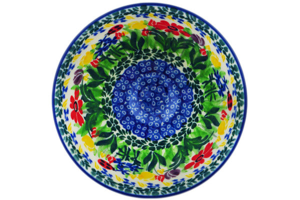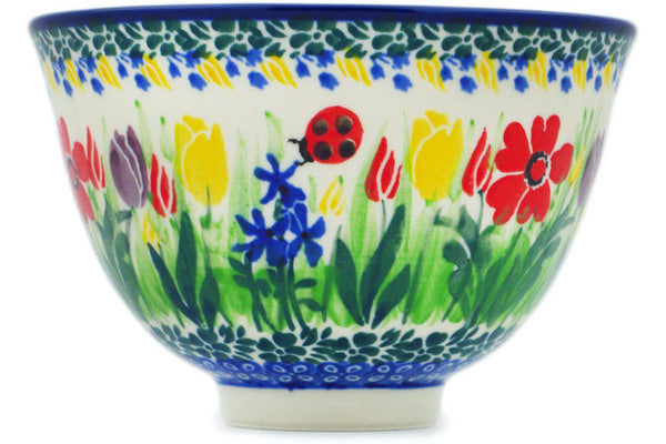 This Lady Bug Tulips 5" Bowl with Pedestal was handmade and hand decorated in Boleslawiec, Poland by skilled artisans according to old traditional methods. This is a Polish pottery Signature Unikat, which means that it has been hand painted with both sponges and brushes and it is signed by the artist who painted it. Unikat pieces are the most intricate works of art. Larger Unikat items take hours of very careful work to finish. This Polish stoneware is microwave, dishwasher, freezer, and oven safe up to 480°F. It does not contain lead or cadmium. It is part of the Lady Bug Tulips Collection.