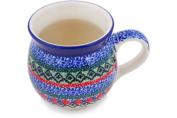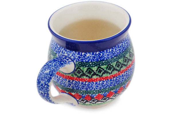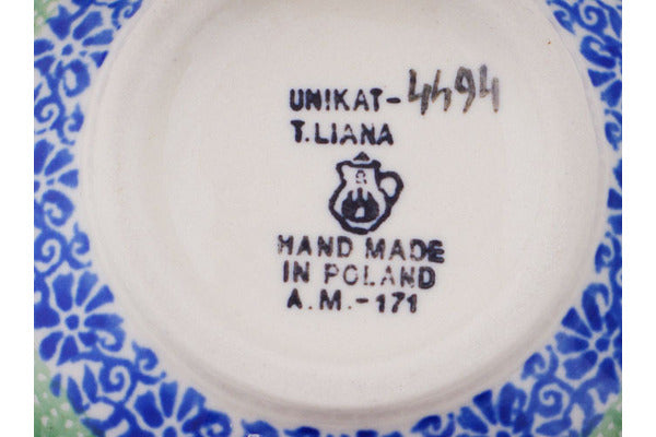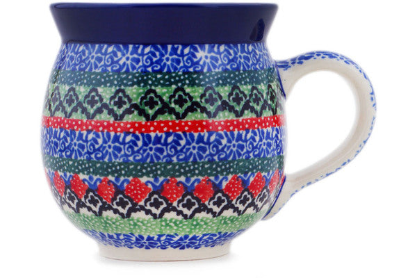 This Moving Mosaic 12oz Bubble Mug was handmade and hand decorated in Boleslawiec, Poland by skilled artisans according to old traditional methods. This is a Polish pottery Signature Unikat, which means that it has been hand painted with both sponges and brushes and it is signed by the artist who painted it. Unikat pieces are the most intricate works of art. Larger Unikat items take hours of very careful work to finish. This Polish stoneware is microwave, dishwasher, freezer, and oven safe up to 480°F. It does not contain lead or cadmium. It is part of the Moving Mosaic Collection.