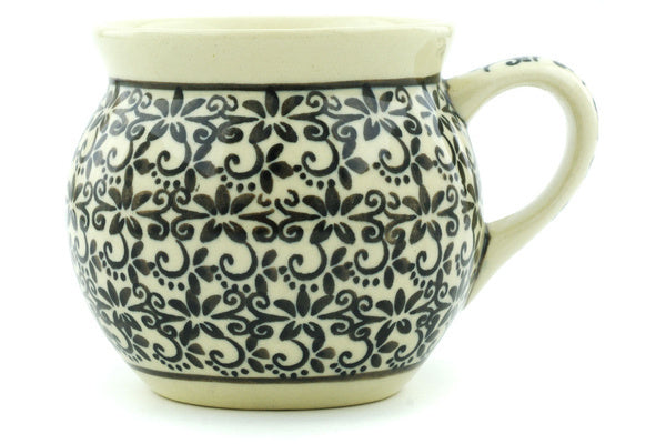 This Black Lace Vines 7 oz Bubble Mug was handmade and hand decorated in Boleslawiec, Poland by skilled artisans according to old traditional methods. This Polish stoneware is microwave, dishwasher, freezer, and oven safe up to 480°F. It does not contain lead or cadmium. It is part of the Black Lace Vines Collection.