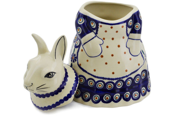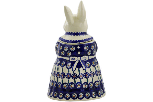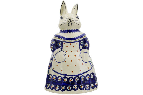 This Peacock 11" Bunny Shaped Jar was handmade and hand decorated in Boleslawiec, Poland by skilled artisans according to old traditional methods. This Polish stoneware is microwave, dishwasher, freezer, and oven safe up to 480°F. It does not contain lead or cadmium. It is part of the Peacock Collection.