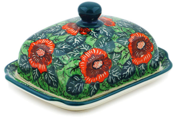 Butter Dish 7" Bold Red Sunflower Theme UNIKAT