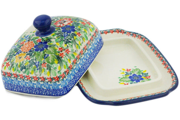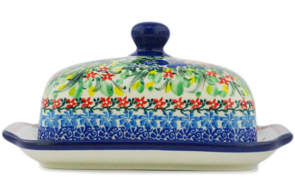This Hummingbird Meadow 7" Butter Dish was handmade and hand decorated in Boleslawiec, Poland by skilled artisans according to old traditional methods. This is a Polish pottery Signature Unikat, which means that it has been hand painted with both sponges and brushes and it is signed by the artist who painted it. Unikat pieces are the most intricate works of art. Larger Unikat items take hours of very careful work to finish. This Polish stoneware is microwave, dishwasher, freezer, and oven safe up to 480°F. It does not contain lead or cadmium. It is part of the Hummingbird Meadow Collection.